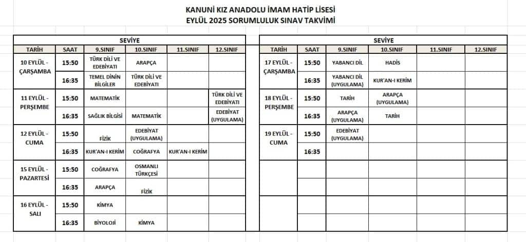 Sınav takvimi aşağıdaki tabloda belirtilmiştir.